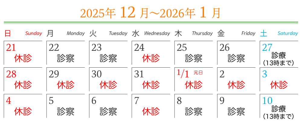 HOME お知らせ 年末年始休診のお知らせ 年末年始休診のお知らせ 2025年12月5日 2025年12月28日(日)から2026年1月4日(日)まで年末年始の休診とさせていただきます。1月5日(月)から通常診療いたします。ご不便をおかけいたしますが、よろしくお願いいたします。